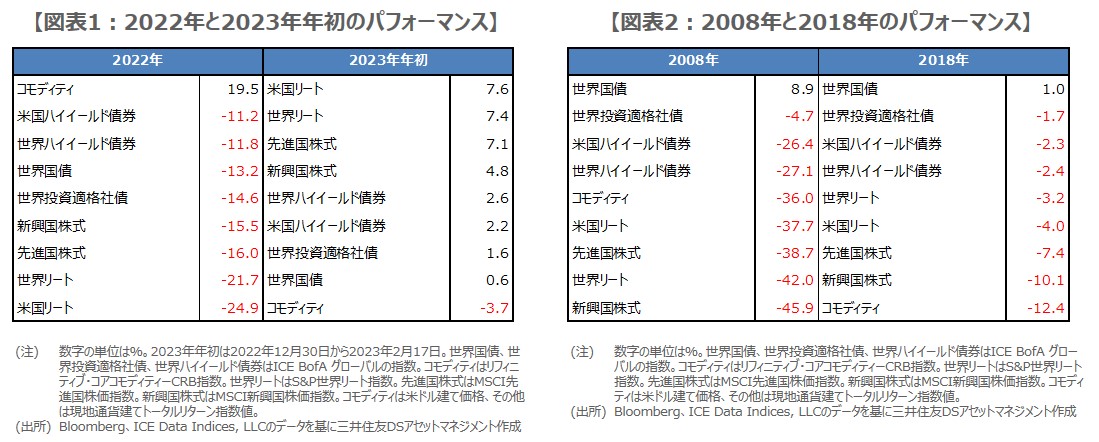 次に、2023年年初のパフォーマンスを確認してみます。2022年12月30日から2023年2月17日までの期間、上昇率の第1位は米国リートの7.6%で、第2位は世界リートの7.4%でした。続く第3位は先進国株式の7.1%、第4位は新興国株式の4.8%となっており、昨年低迷したリートと株式が上位を占めました(図表1)。以下、ハイイールド、社債、国債の順となり、昨年上昇したコモディティはマイナス圏に沈みました。