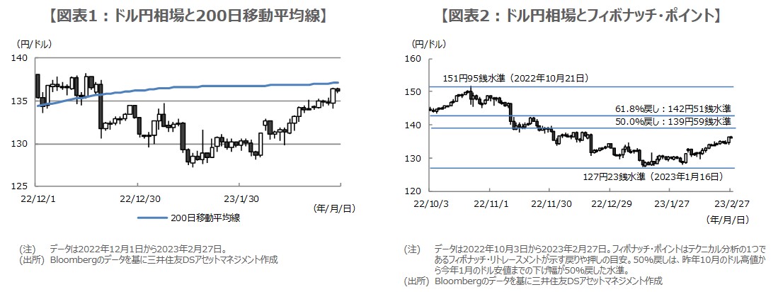 これらのイベントなどで、FRBの利上げ長期化や、日銀の異次元緩和継続が確認されれば、ドル円は200日移動平均線(図表1)を超え、フィボナッチ・ポイントの139円59銭水準や、142円51銭水準が視野に入ります(図表2)。ただ、弊社はこの先、米景気減速とインフレ鎮静化で利上げは5月終了、YCCは4-6月期に変動幅再拡大で実質形骸化を見込んでおり、ドル安・円高の基調は変わらず、ドル円は年末128円での着地を予想しています。