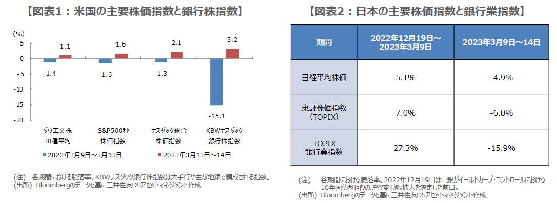 このように考えた場合、事態は1つ目のケースでおさまるか、2つ目のケースに至るか、ということになりますが、1つのカギを握るのは、やはり銀行株の動向です。米国では昨晩、いったん反発しており(図表1)、これが底入れにつながるか注目されます。なお、日本の銀行株は、日銀の緩和修正期待から物色が進んでいたため、大きな変動がみられます(図表2)。いずれにせよ、目先は銀行株中心に、慎重な見極めが必要と思われます。