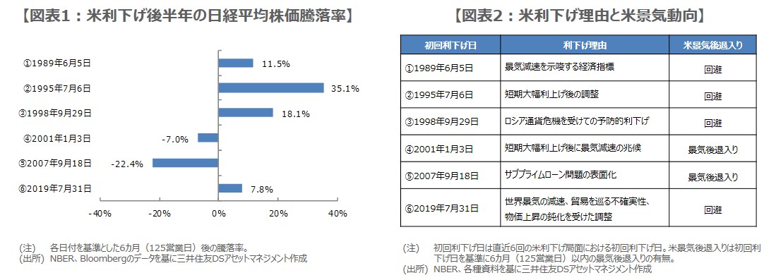 米利下げ後、半年以内に米景気後退入りなら日米ともに株安、回避なら株高の傾向がみられる