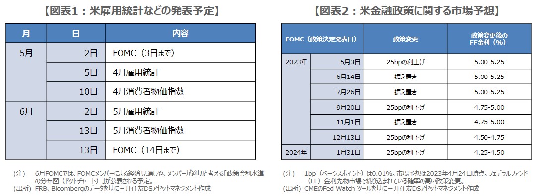 米連邦準備制度理事会(FRB)は、5月2日、3日に米連邦公開市場委員会(FOMC)を開催します。弊社は今回、25ベーシスポイント(bp、1bp=0.01%)の追加利上げが行われると予想していますが、フェデラルファンド(FF)金利先物市場でも、25bpの利上げ確率は足元で9割を超えており、実際に25bpの追加利上げが決定されれば、FF金利の誘導目標は5.00%~5.25%に達することになります。