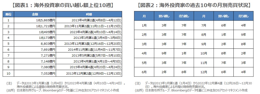 過去10年の動きを検証すると、海外投資家はとりわけ4月に現物株を大きく買い越す傾向がある