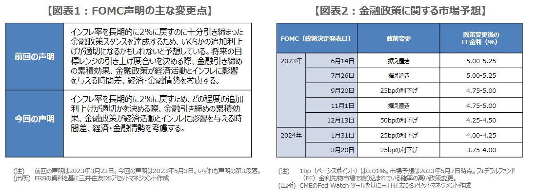 米連邦準備制度理事会(FRB)は、5月2日、3日に米連邦公開市場委員会(FOMC)を開催し、フェデラルファンド(FF)金利の誘導目標について、4.75%~5.00%から5.00%~5.25%へ引き上げることを決定しました。利上げはほぼ織り込み済みでしたので、今回は、先行きの政策判断について、どのような手掛かりが示されるかに市場の注目が集まっていました。