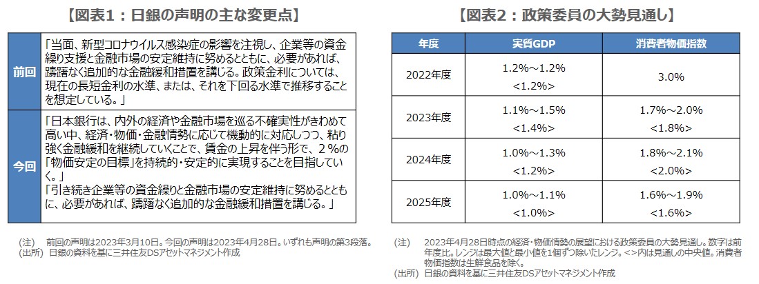 なお、今会合では、次の3つの点が新たに確認されました。1点目は、会合後に公表された声明の一部修正です(図表1)。声明では、「粘り強く金融緩和を継続していくことで、賃金の上昇を伴う形で」、2%の物価目標を持続的・安定的に実現する旨が新たに明記されました。また、新型コロナウイルス感染症の部分と、政策金利の指針に関する表記は、今回削除されました。