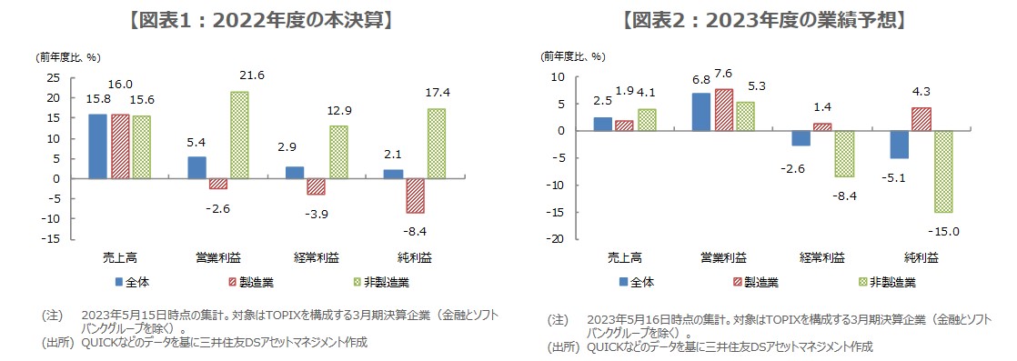 東証株価指数(TOPIX)を構成する3月期決算企業(金融とソフトバンクグループを除く)のうち、5月15日までに2022年度の決算発表を終えた企業は1,200社を超えました。決算発表の進捗率は、企業数ベースで92%を超え、決算発表はほぼ終了したといえます。2022年度の実績は、前年度比で売上高は15.8%増、営業利益は5.4%増、経常利益は2.9%増、純利益は2.1%増となり、増収増益ながら利益の伸びは1ケタにとどまりました(図表1)。