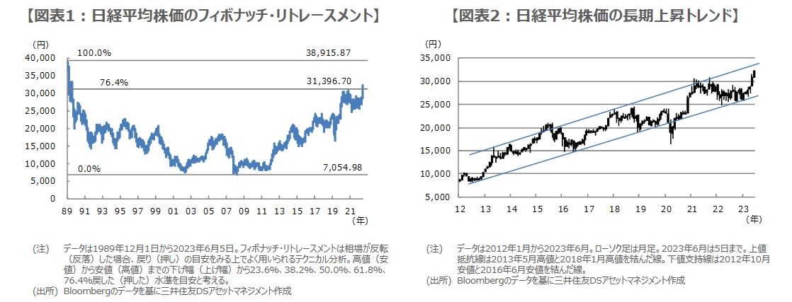 日経平均の過去最高値は1989年12月29日の38,915円87銭、過去最安値は2009年3月10日の7,054円98銭です(終値ベース)。この下げ幅(31,860円89銭)から、「フィボナッチ・リトレースメント」で目安とされる「76.4%戻し」は31,396円70銭で、ここが1つの上値目途でした。ただ、日経平均は6月2日の終値(31,524円22銭)でこの水準を超えたため(図表1)、過去最高値までの「100%戻し(全値戻し)」が視野に入りました。