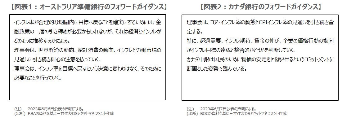 BOCは声明で、物価の高止まりと需要超過の継続に触れ、「インフレ率が目標の2%を大幅に上回って推移する可能性への懸念が強まっている」と述べ、「金融政策が需給を均衡させ、インフレ率を持続的に2%の目標に戻すには十分に引き締め的ではない」ため、利上げを決定したと説明しました。フォワードガイダンスでは、「政策金利をさらに引き上げる用意がある」との文言が削除され、政策予想の手掛かりは経済指標のみとなりました(図表2)。