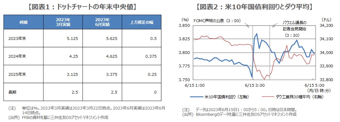 次に、FOMCメンバーが適切と考える「政策金利水準の分布図(ドットチャート)」では、2023年末から2025年末までのドット中央値が上方修正され、2023年末は5.625%、2024年末は4.625%、2025年末は3.375%となりました(図表1)。また、経済見通しでは、2023年分について、実質GDP成長率と物価上昇率の予想中央値が引き上げられ、失業率の予想中央値は引き下げられました。