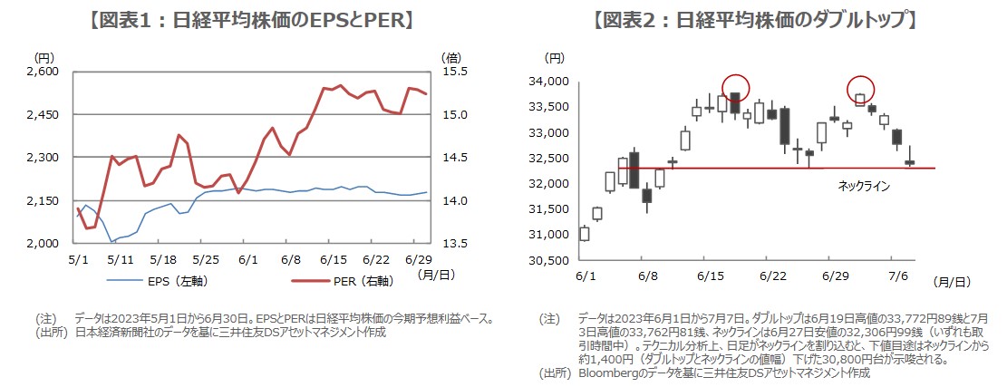 また、7月上旬は、決算を迎える上場投資信託(ETF)からの分配金捻出のための売りが見込まれていたため、これも一定程度、株価を押し下げる方向に作用したと思われますが、季節要因のため、需給悪化は一過性のものと考えます。ただ、日経平均は短期的にダブルトップを形成しており(図表2)、ネックラインの32,300円水準を大きく割り込むと、テクニカル分析上、30,800円台までの調整が示唆されることになります。