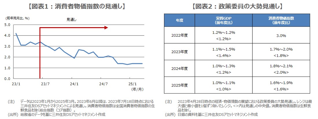弊社は従来、今会合でYCCの許容変動幅が上下0.5%から1.0%に再拡大されるとみていましたが、7月18日にYCCは現状維持との見方に変更しました。変更の理由は、①現時点でYCCの副作用増大により、債券市場の機能が大きく低下する状況には至っておらず、修正を急ぐ必要性は低いと判断したこと、②弊社の最新の物価見通しに基づき(図表1)、2%の物価安定の目標が達成される可能性は依然低いと判断したことです。