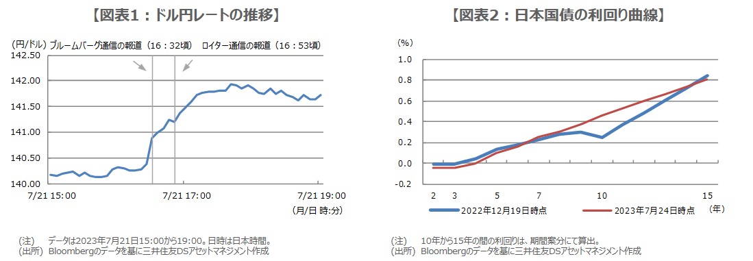 また、7月22日付の読売新聞朝刊は、YCCの変動幅について見直しの議論はするものの、「現在の大規模な金融緩和を続ける方針」と報じました。これら一連の報道を受け、市場ではYCC修正観測が大きく後退し、ドル円は、ブルームバーグ通信とロイター通信の報道が続いた7月21日夕刻、1ドル=140円台前半から142円手前まで、一気にドル高・円安が進行しました(図表1)。