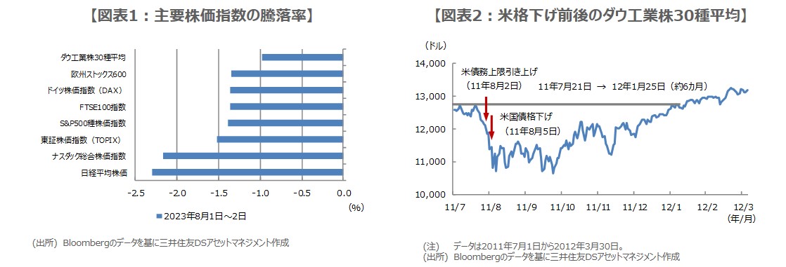 大手格付け会社フィッチ・レーティングスは8月1日、米国の外貨建て長期債務格付けを最上位の「トリプルA」から1段階低い「ダブルAプラス」に引き下げを発表しました。これを受け、世界の主要株価指数は2日、軒並み大幅安の展開となり(図表1)、為替市場では日本円、米ドル、スイス・フランが対主要通貨で買われるなど、リスクオフ(回避)の動きが鮮明となりました。