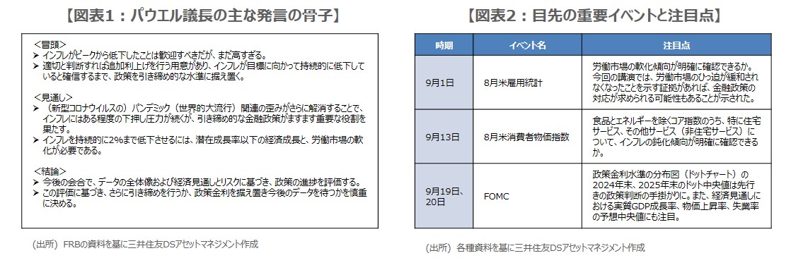 このシナリオでは、急激な米長期金利の上昇と大幅なドル高・円安の進行は回避され、株式市場にも好ましい環境が期待されます。なお、FRBがデータ次第としている以上、この先、雇用や物価関連の指標に市場が大きく反応することもあり、注意が必要です(図表2)。また、9月の米連邦公開市場委員会(FOMC)では、最新の経済見通しなどで今回の講演よりも詳細な政策方針が確認できると思われ、いつも以上に注目が集まるとみています。