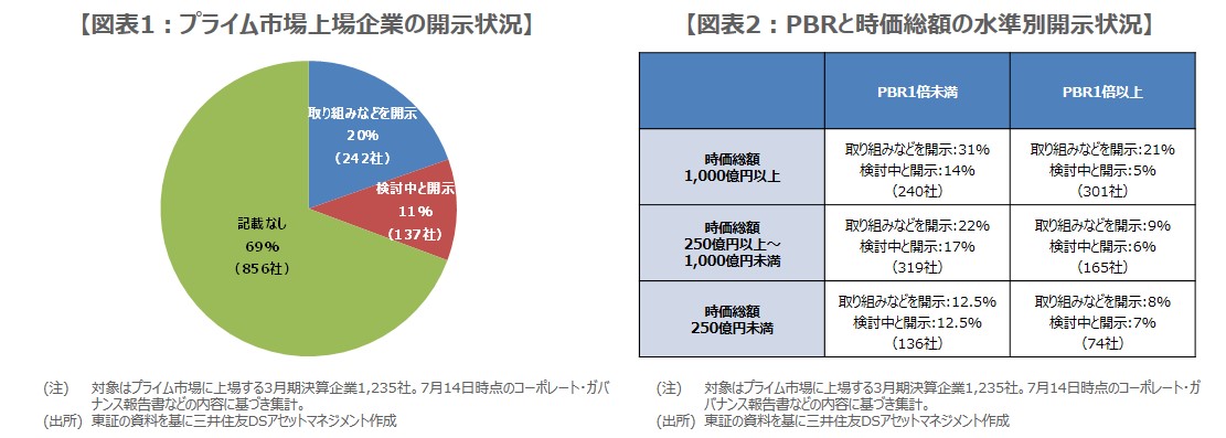 開示状況をみると、プライム市場に上場する1,235社のうち、東証の要請を受けた取り組みなどを開示したのは20%(242社)、検討中と開示したのは11%(137社)、記載がなかったのは69%(856社)でした(図表1)。また、スタンダード市場については、同市場に上場する887社のうち、取り組みなどを開示したのは4%(32社)、検討中と開示したのは10%(88社)、記載がなかったのは86%(767社)でした。