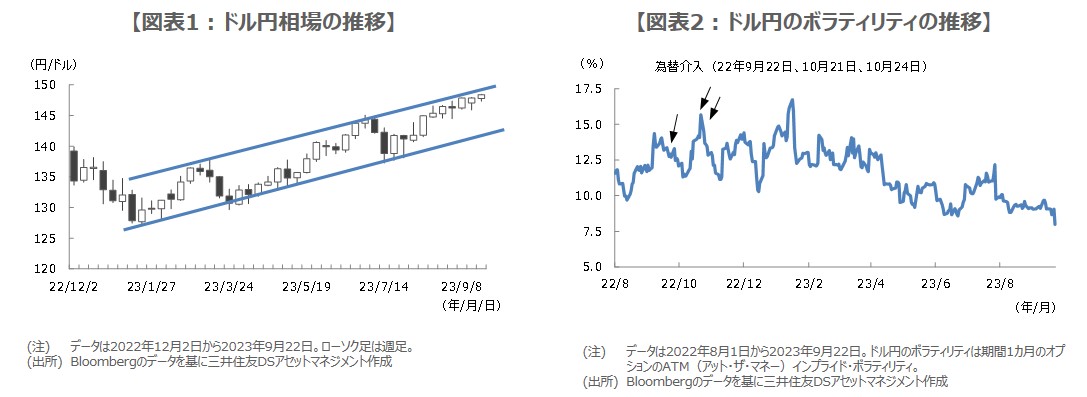 つまり、今回のFOMCは、政策金利水準がより高くより長くなることを、そして日銀金融政策決定会合は、金融緩和は当面継続される可能性が高いことを、それぞれ市場に意識させる結果となり、ドル円については、ドル買い・円売りの材料になりやすいと思われます。改めて、年初からのドル円相場の推移を振り返ると、図表1の通り、ドル高・円安トレンドにあることが確認されます。