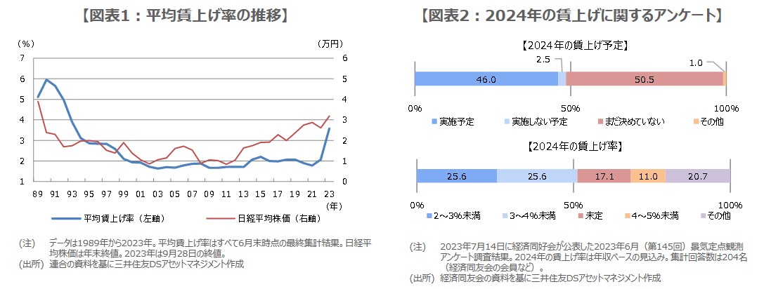 連合のデータに基づき、1989年から2023年までの賃上げ率の推移を示したものが図表1です。1989年から1991年まで、賃上げ率は5%台でしたが、バブル崩壊とともに低下の一途をたどり、2003年には1.63%の低水準となりました。賃上げ率の推移に日経平均株価の推移を重ねると、連動性の高い時期も多くみられることから、株高の持続性を考える上で、2024年の賃上げ動向は、極めて重要と思われます。