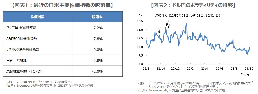 米10年国債利回りは8月に、しっかり4%台乗せとなった後、米経済の底堅さを背景に、上昇基調が続いています。長期金利が上昇する環境のなかでは、株価収益率(PER)の高いハイテク株の相対的な割高感が意識されやすく、このところの米主要株価指数の動きをみると、やはりハイテク株比率が高いナスダック総合株価指数のパフォーマンスは低調です(図表1)。また、米株安の影響は日本株にも及んでいることが確認されます。