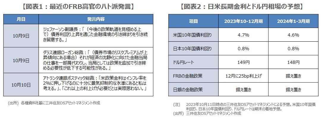 このところ、米連邦準備制度理事会(FRB)の高官からハト派的な発言が相次ぎ、米長期金利が大幅に低下しています。米10年国債利回りは10月6日、9月の米雇用統計の発表を受け、一時4.88%台まで上昇しましたが、その後、ジェファーソン副議長らが国債利回りの上昇を通じた金融環境の引き締まりについて言及し、追加利上げの必要性の低下を示唆したことなどから(図表1)、10月10日には4.61%台まで低下する場面もみられました。