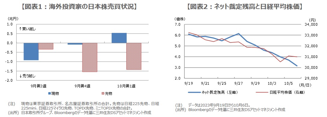 はじめに海外投資家による現物の売買状況を確認すると、9月第3週は9,132億円の売り越しとなったものの、第4週は776億円の売り越しに減少し、10月第1週は5,263億円の買い越しに転じました(図表1)。一般に、現物を取引する海外投資家には中長期的な視点で運用を行う年金などが含まれるとされ、日本株が水準を切り下げた場面で、押し目買いに動いた様子がうかがえます。