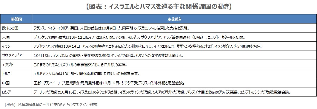 今回のイスラエルとハマスの衝突については、パレスチナ問題の歴史を踏まえ、10月10日付レポートで、その背景を解説しました。そして、金融市場への影響を考える場合、米国や中東周辺国を巻き込む形で、紛争が広がるか否かが焦点になることも説明しました。その後、イスラエルとハマスを巡り、関係諸国に様々な動きがみられるようになったため、以下、主なものをまとめておきます(図表)。