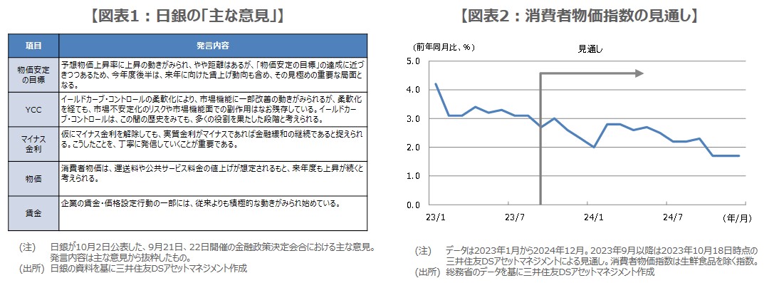 ③について、具体的な発言をいくつかまとめたものが図表1です。これをみると、2%の「物価安定の目標」を持続的・安定的に実現するタイミングに言及するものや、YCCの役割終了とも受け止められるコメントに加え、マイナス金利解除でも緩和継続とする発言や、物価の上振れリスクや賃金上昇に強気の見解が確認されます。これらを踏まえると、9月の会合では、異次元緩和の終了をある程度視野に入れた議論が行われたと推測されます。