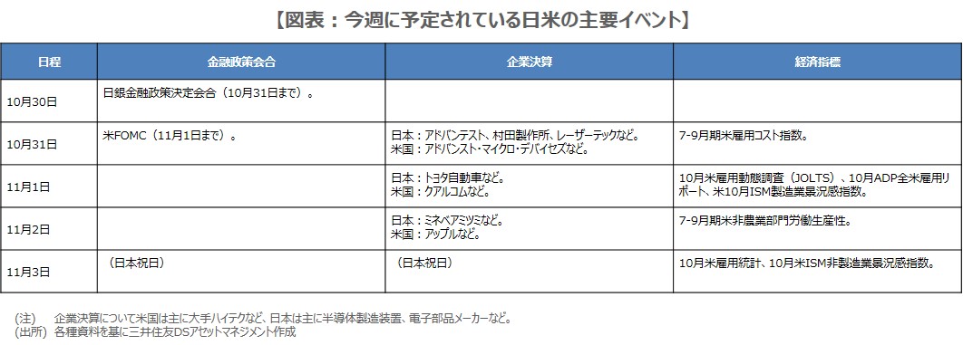 最後に、経済指標に目を向けると、米国では10月31日に雇用コスト指数、11月1日に雇用動態調査(JOLTS)、ADP全米雇用リポート、米サプライマネジメント協会(ISM)製造業景況感指数、2日に非農業部門の労働生産性、3日に雇用統計、ISM非製造業景況感指数が発表されます。雇用関連の指標が多く、労働市場の減速傾向が確認されれば、米国市場では、長期金利低下、ドル安、株高の反応が予想されます。