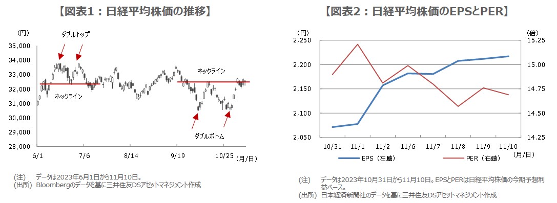 日経平均はその後、夏場にかけて横ばい推移が続きましたが、10月に入ると下げ足を速め、10月4日には30,487円67銭の安値をつけ、前述の下値目途を割り込みました。しかしながら、10月4日安値と10月30日安値(30,538円29銭)で今度はダブルボトムが形成され、11月6日にネックラインの10月13日高値(32,533円08銭)を突破したことで株価上昇のシグナルが点灯し、上値目途として34,600円近辺が示唆されました。