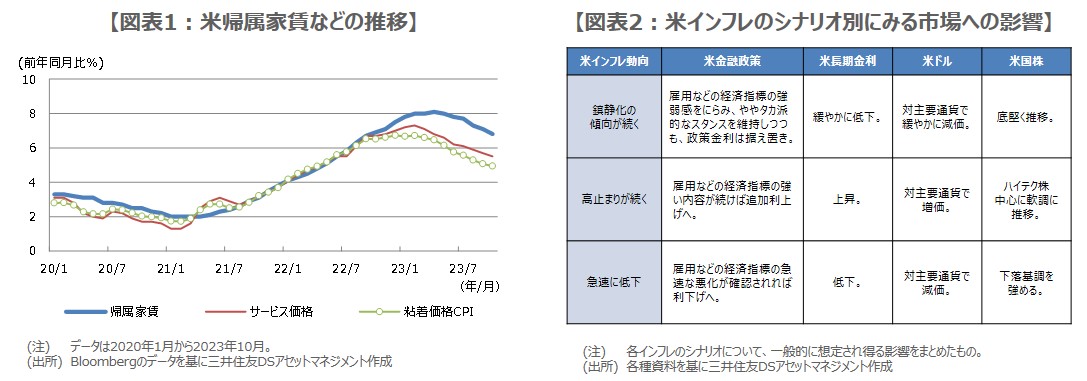 米国の物価見通しについて、シナリオ別に金融政策、米長期金利、米ドル、米国株への想定され得る影響をまとめたものが図表2です。米国でインフレ鎮静化の傾向が続く場合、FRBは雇用などの経済指標の強弱感をにらみ、ややタカ派的なスタンスを維持しつつも、政策金利を据え置く公算が大きいと思われます。政策の舵取りが奏功すれば、米長期金利は緩やかな低下、米ドルは対主要通貨で緩やかな減価、米国株は底堅い動きが予想されます。
