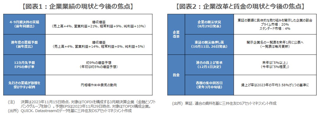 弊社は2024年度の企業業績も底堅く推移すると予想していますが、業績が影響を受けやすい円相場や米中景気の動向などには注意が必要です。企業改革については、前述の通り2024年1月15日に東証の要請への取り組みを開示する企業名が公表され、一定程度の進展が確認されるとみています。そして、賃金に関し、来年の平均賃上げ率は今年に近い数字となり、賃上げ傾向が続く可能性が高いと考えています。