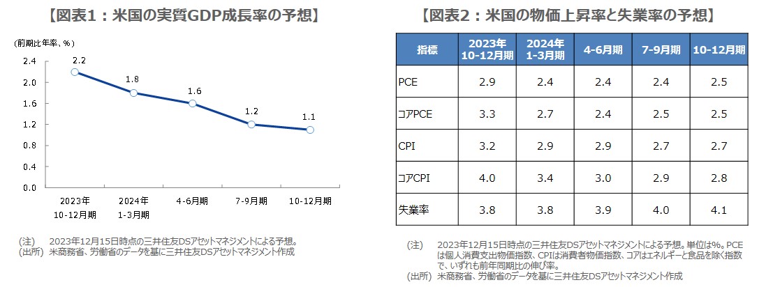 個人消費支出(PCE)物価指数の前年同期比伸び率は、2023年10-12月期が+2.9%、2024年1-3月期が+2.4%、4-6月期が+2.4%、7-9月期が+2.4%、10-12月期が+2.5%を予想しており、失業率は、2023年10-12月期が3.8%、2024年1-3月期が3.8%、4-6月期が3.9%、7-9月期が4.0%、10-12月期が4.1%との見方です(図表2)。現時点で、大幅なインフレ鈍化や雇用情勢の悪化は想定していません。