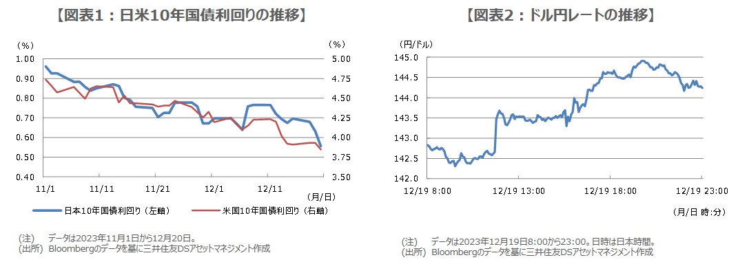 日本の10年国債利回りは12月20日、一時0.550%と、約5カ月ぶりの低水準をつけました。次回2024年1月の会合でのマイナス金利解除は難しいとの思惑が広がり、国債の買い戻しにつながったと推測されます。ただ、長短金利操作(イールドカーブ・コントロール、YCC)の運用柔軟化により、国債利回りは市場で形成されやすくなっているため、このところの米10年国債利回りの低下につれた面もあると考えます(図表1)。