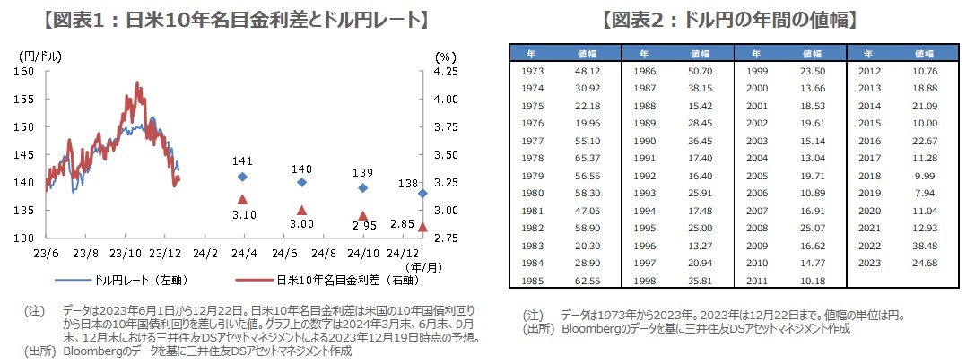 このように、米国の長期金利が緩やかに低下する一方、日本の長期金利は一進一退が続くとの見通しのもとでは、日米の長期金利差はそれほど大きく縮小しない公算が大きいということになります(図表1)。この点を勘案すると、2024年のドル円は、緩やかなペースでのドル安・円高の進行が予想され、弊社は3月末の着地を141円、6月末は140円、9月末は139円、12月末は138円を予想しています(図表1)。