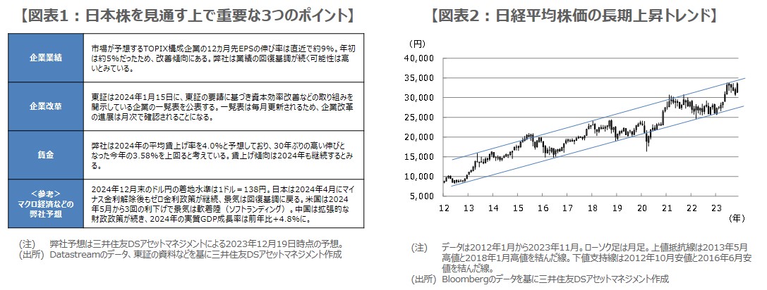 2024年の日本株を見通す上で重要な3つのポイントは、「企業業績」、「企業改革」、「賃金」です(図表1)。まず、企業業績について、市場が予想する東証株価指数(TOPIX)構成企業の12カ月先1株あたり利益(EPS)は引き続き増加傾向にあり、現時点で株価の支援材料となっています。この先は、円相場や米中景気の動向に注意を要しますが、弊社は業績の回復基調が続く可能性は高いとみています。