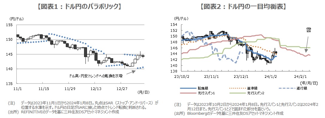 ここで、足元のドル高・円安の動きをテクニカル分析で確認します。具体的には、昨年11月22日付レポートと12月8日付レポートで解説した、「パラボリック」と「一目均衡表」を用います。まず、パラボリックからみていくと、直近ではドル円の日足が1月4日にSAR(ストップ・アンド・リバース)に接し、ドル高・円安へのトレンド転換が示唆されています(図表1)。この点を踏まえると、ドルは対円でしばらく底堅い推移が予想されます。