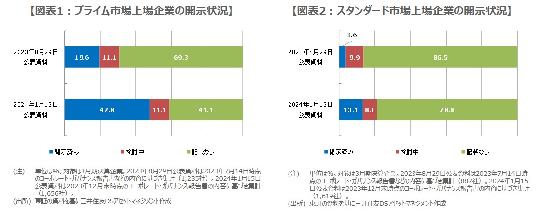 具体的な開示状況をみると、プライム市場上場企業(1,656社)のうち、開示済みが39.9%、検討中は9.4%、記載なしは50.8%でした。なお、昨年8月の資料は3月期決算企業のみを対象としていましたが、今回も3月期決算企業のみを対象としたデータが公表されたため、比較してみると、開示済みは19.6%から47.8%に増加、検討中は11.1%でほぼ変わらず、記載なしは69.3%から41.1%に減少し(図表1)、企業改革の進展が確認されました。