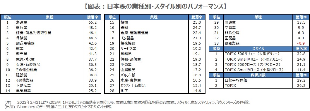 具体的な騰落率は図表の通りです。業種別にみると、パフォーマンスの高い順に、海運業(66.2%)、銀行業(48.2%)、証券・商品先物取引業(46.4%)、保険業(44.5%)、輸送用機器(42.6%)となっており、これに、鉱業(42.4%)、卸売業(41.3%)、電気・ガス業(37.7%)、石油・石炭製品(36.3%)、その他金融業(36.2%)が続きます。上位には、一般に「割安」、「高配当」とされる業種が多く、また、「内需」がやや多いように思われます。