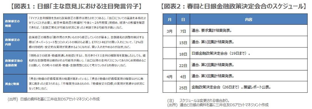 日銀は1月31日、金融政策決定会合(1月22日、23日開催分)の発言内容をまとめた「主な意見」を公表しました。今回は、異次元緩和からの出口を意識したコメントが多くみられ、以下、注目点をまとめていきます。まず、金融政策運営に関する意見では、「マイナス金利解除を含めた政策修正の要件は満たされつつある」、「出口についての議論を本格化させていくことが必要」などの声があがりました(図表1)。