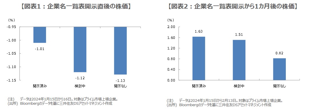 1月15日に東証が資料を公表した直後、積極開示の企業群の株価は、相対的に良好な反応に