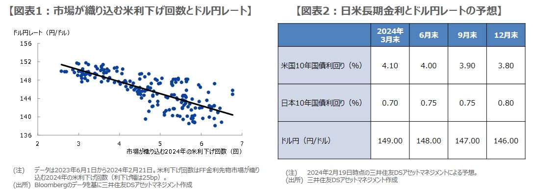 弊社は米金融政策について、最初の25ベーシスポイント(bp、1bp=0.01%)の利下げは5月と予想していましたが、米景気の底堅さを踏まえ6月に変更しました。ただ、2024年の利下げは四半期に1回、25bpずつ、年内は合計3回との見方は維持していますので、弊社の予想とFF金利先物市場の織り込みに差が生じなければ、ドル円はここからドル高・円安にも、ドル安・円高にも、大きく振れる公算は小さいとみています。
