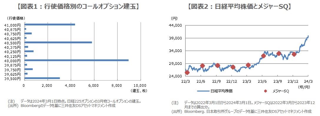 そこで、日経225オプションに目を向けると、3月物コールオプションは3月1日時点で行使価格40,000円の建玉(たてぎょく、未決済残高のこと)が、大きく積み上がっていることが分かります(図表1)。そのため、例えば日経平均が40,000円を超えて上昇すると、行使価格40,000円のコールオプションの売り手には損失が発生することから、売り手は別途、日経225先物を買って、「デルタヘッジ」を行うことがあります。