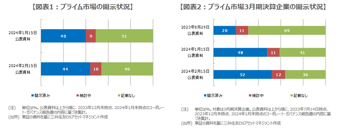 結果は図表2の通りで、開示済みは52%、検討中は12%、記載なしは36%となり、プライム市場に上場する3月期決算企業の開示済み割合は50%を超えてきました。一覧表は今後、毎月公表され、企業の取り組み開示は引き続き着実に進展していくと思われます。ただ、時間の経過とともに、投資家の関心は、開示の有無ではなく、中長期的な企業価値向上の実現に向けた取り組みが適切に行われ、具体的な成果を得られるかに移行するとみています。