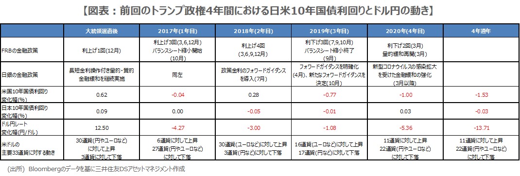 3月11日付レポートでは、トランプ政権時代の米国株の推移を検証しましたが、今回は日米長期金利とドル円の動きを確認します。2016年11月8日の米大統領選挙でトランプ氏が勝利すると、大規模減税への期待から、市場では「トランプ・ラリー」と呼ばれる現象が発生しました。年末にかけて株価が世界的に上昇し、10年国債利回りは日米ともに上昇、為替市場では米ドルがほぼ全面高となり、ドル円はドル高・円安方向に振れました(図表)。