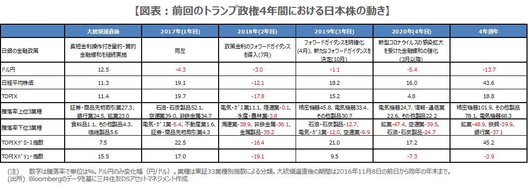 今週のレポートでは、トランプ前政権で米国株、日米長期金利、ドル円がどのように動いたかを検証しました。今回は日本株の推移を振り返り、改めて米大統領選挙でトランプ氏が勝利した場合の市場への影響について考えます。まず、日本株について結論から申し上げると、トランプ前政権の4年間において、基本的には米国株と同じ動きがみられました。以下、詳しくみていきます。