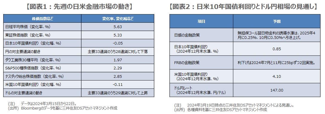 ●先週、日銀はマイナス金利解除を決定、FRBは政策据え置きを決め年3回の利下げ予想を維持。