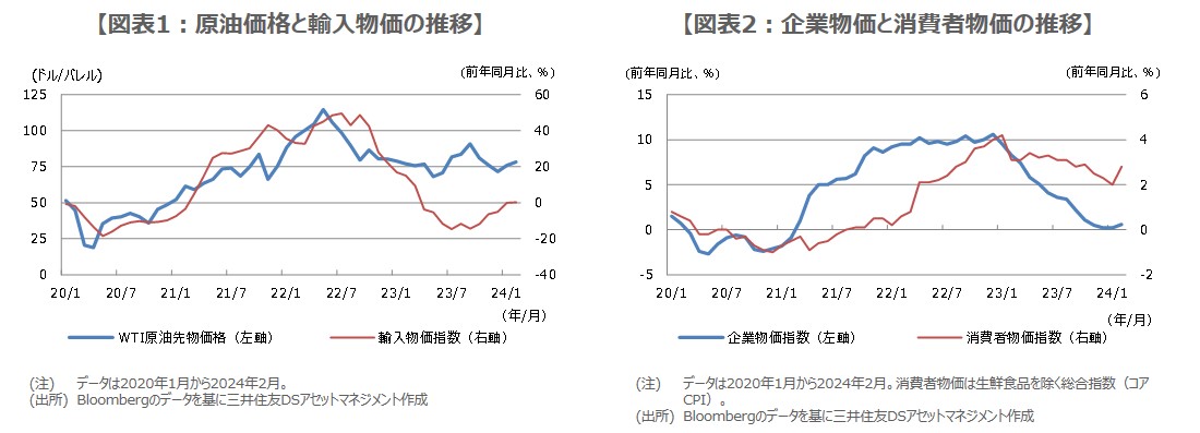 コロナの感染拡大により、生産や物流に制約が生じた一方、感染一服後はリベンジ消費が急拡大し、需要に供給が追いつかず、多くの国で物価が上昇しました。また、ロシアのウクライナ侵攻の影響で、原油などエネルギー価格が高騰したことも、物価上昇に拍車をかけました。エネルギーの8割以上を輸入している日本は、円安の進行も重なり、原油高が輸入物価を押し上げ(図表1)、企業物価に波及し、国内の物価上昇につながりました(図表2)。
