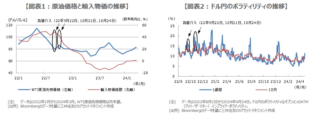 なお、前回の為替介入は2022年の秋に実施されましたが、WTI原油先物価格は春先に一時1バレル=130ドル台をつけ、輸入物価指数は7月に前年同月比で49.5%上昇していました(図表1)。現在、WTI原油価格は80ドル台前半で、輸入物価指数の前年同月比の伸び率は直近3月で1.4%です。前回の介入時、円安は輸入コストを押し上げ、国内のインフレを加速させる「悪い円安」といわれましたが、今はそのような声はほとんど聞かれません。