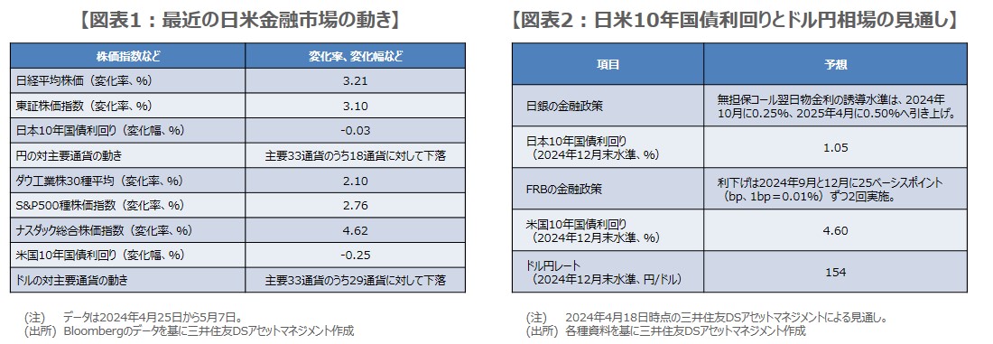 これら一連のイベントを経て、日米とも主要株価指数が上昇、10年国債利回りは低下、対主要通貨で円はまちまち、ドルは下落という動きになりました(図表1)。日銀の次の一手は「利上げ」、FRBは「利下げ」と予想されるため、その織り込みが進めば、日米金利差が縮小し、ドル高・円安の流れは終了が見込まれます(図表2)。したがって、日米とも金融政策の判断に影響する物価の動向が極めて重要になると思われます。