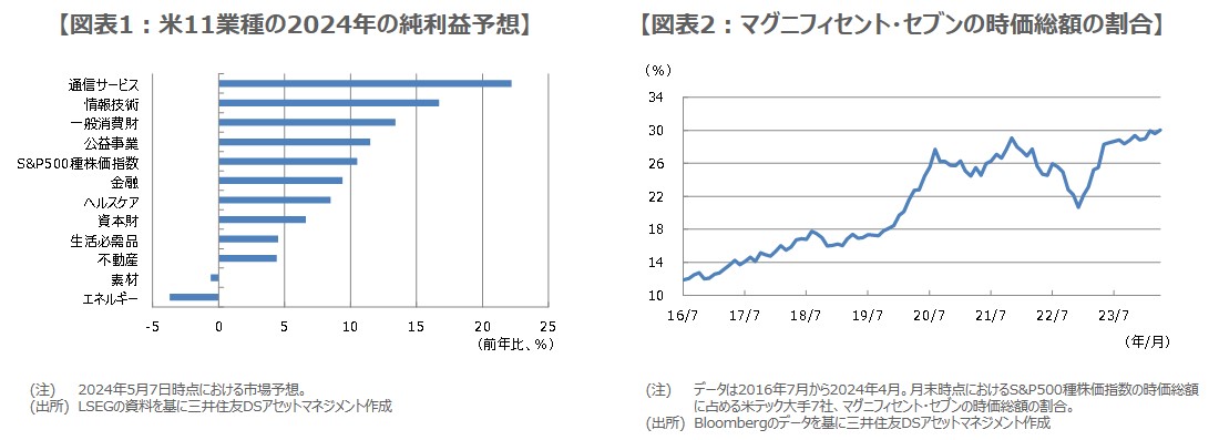 次に、2024年通年の純利益について、市場予想をまとめたものが図表1です。前年比で伸び率の大きい上位3業種は、通信サービス(前年比22.2%)、情報技術(同16.7%)、一般消費財(同13.4%)です。なお、米テック大手7社「マグニフィセント・セブン」は、グーグル親会社のアルファベットとメタ・プラットフォームズが通信サービスに、アップル、マイクロソフト、エヌビディアは情報技術に、アマゾンとテスラは一般消費財に含まれます。