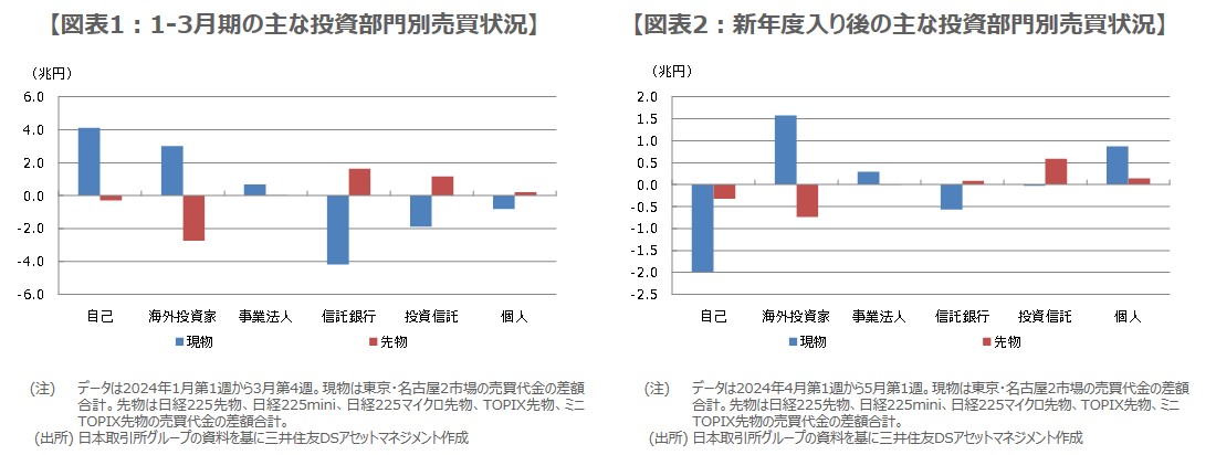 例えば、先物に買いが膨らみ一時的に割高となった場合、証券会社が先物を売って現物を買う「裁定買い取引」を実施すれば、自己に現物買いが計上されると考えられます。そのため、1-3月期において、主な投資部門(自己を除く)に4兆円程度の先物買いと、自己に同程度の先物売りがあれば、自己の現物買いは主に裁定買い取引によるものと推測されますが、図表1の先物売買状況をみる限り、そう考えるのは難しい状況です。