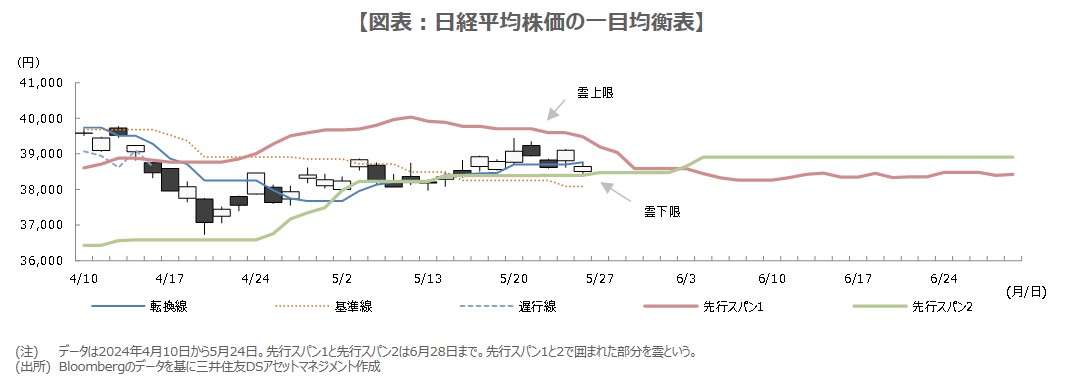 ただ、雲の下限である先行スパン1は、5月29日から31日まで38,582円17銭へ低下しており、日経平均の終値がこの水準を大きく上回れば、上昇トレンドは継続となります。このように、月末38,500円付近はトレンドの分岐点として注目されますが、6月1日から28日までは比較的雲が薄い(38,200円付近~38,900円付近)ため、今週、雲の上抜け(下抜け)度合いが小さければ、6月に再び下抜け(上抜け)という展開も想定されます。